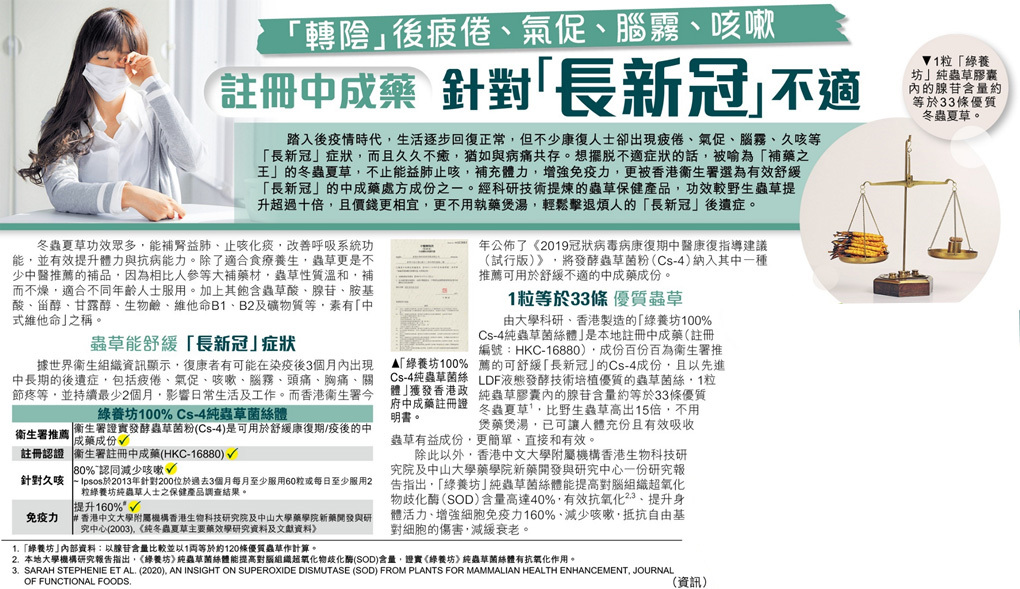 多份報告指出, 蟲草能有效舒緩"長新冠"症狀!