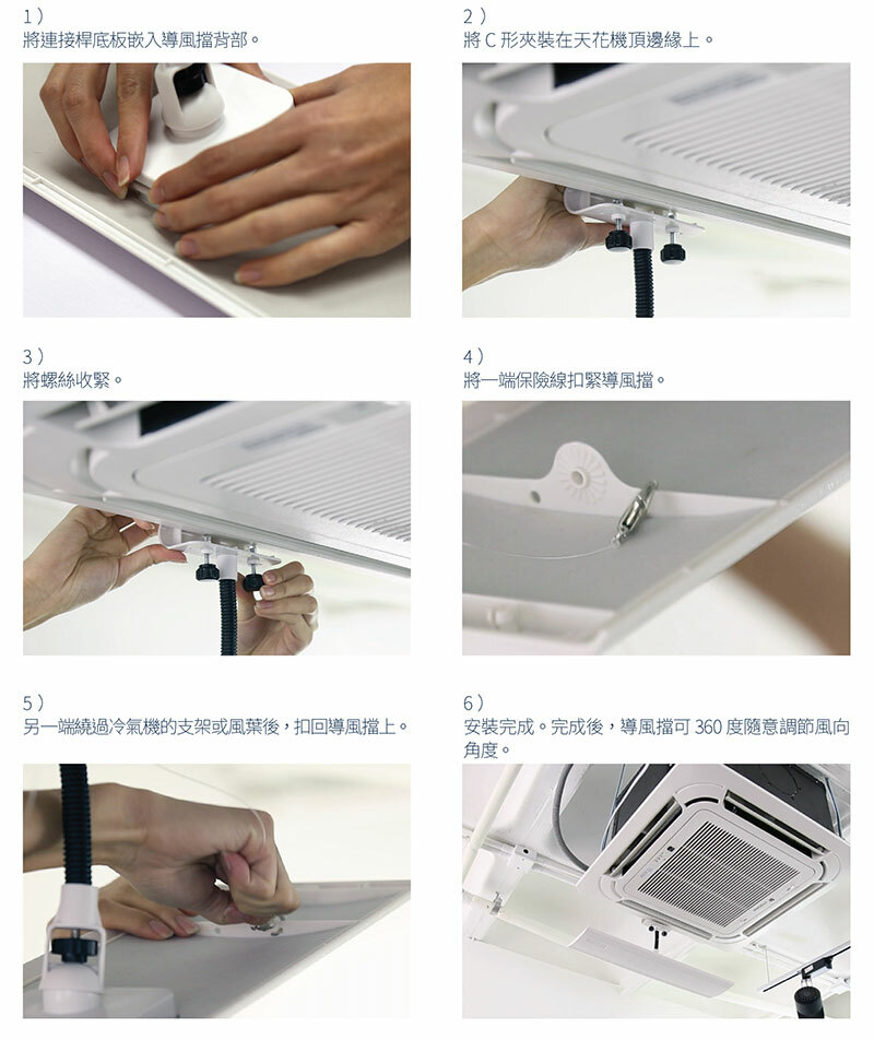 獨有球型連接頭全方位360度風向調節,告別直吹煩惱。導風擋主板為HIPS塑膠物料,體積輕巧,外型美觀。導風擋主板背部配備EVA海綿,不易產生冷凝水。 為了針對黑色天花設計,AE-C1款還有推出全黑色選擇。產品不會影響搖控訊號操作。