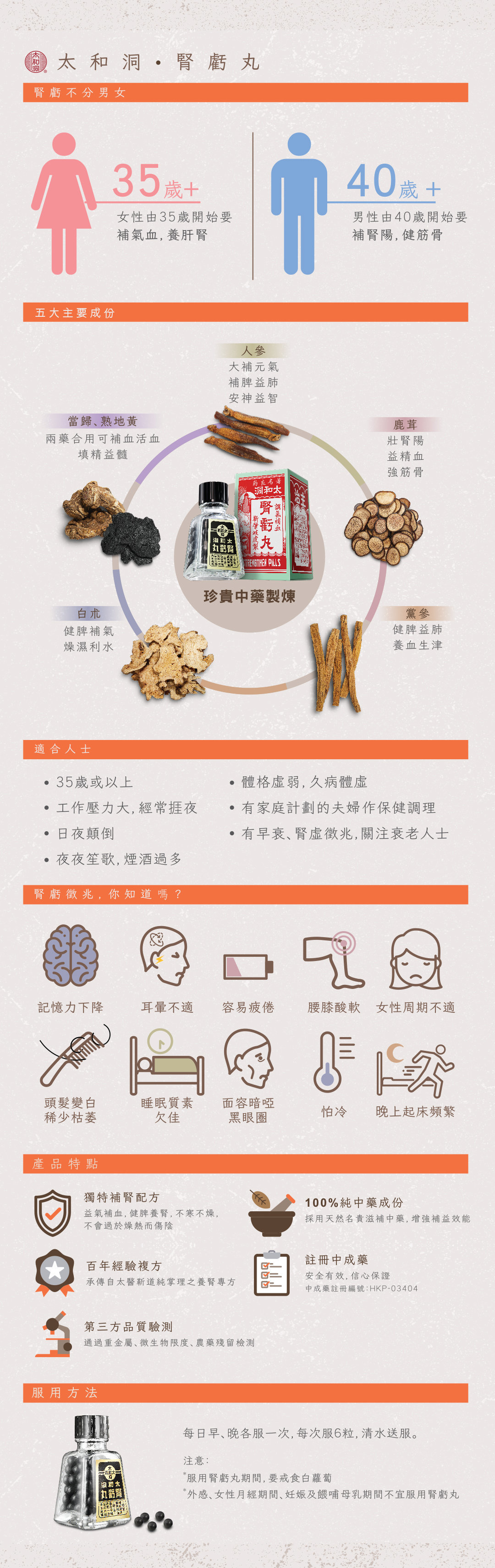 - 太和洞腎虧丸針對氣血虧虛引致的腎虛症狀,如耳暈、怕冷、容易疲倦、腰膝酸軟等,透過珍貴中藥包括人參、鹿茸、當歸等固本配方,以補、調、養為原則,補腎健脾,調氣補血,從而增加協同效應,回復身體整體平衡,倍強體魄,回復青春活力。