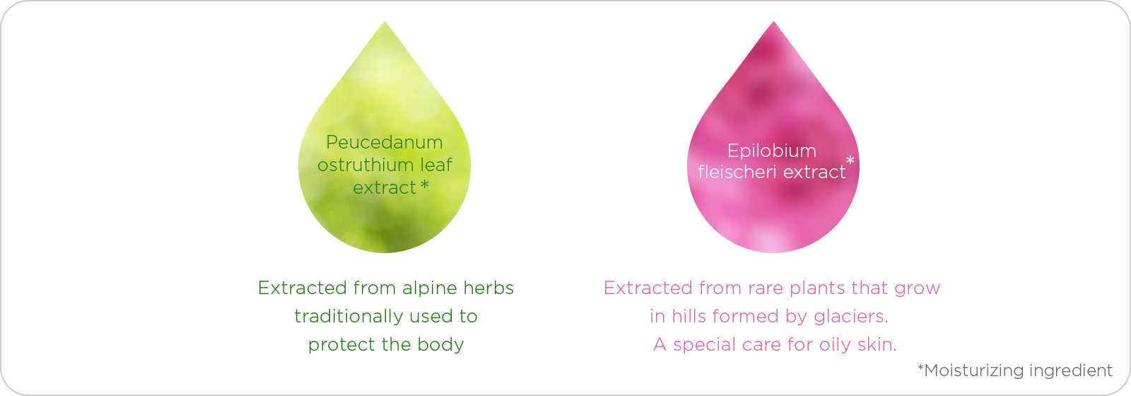 Made with the extracts of rare, organic plants (Peucedanum ostruthium leaf extract and Epilobium fleischeri extract) grown in alpine environments. Treats everyday skin damage while addressing excess sebum. Also it contains ingredients which would enhance elasticity, three types of ceramides, botanical extracts, vitamins (derivatives), shea butter, and other beneficial components.